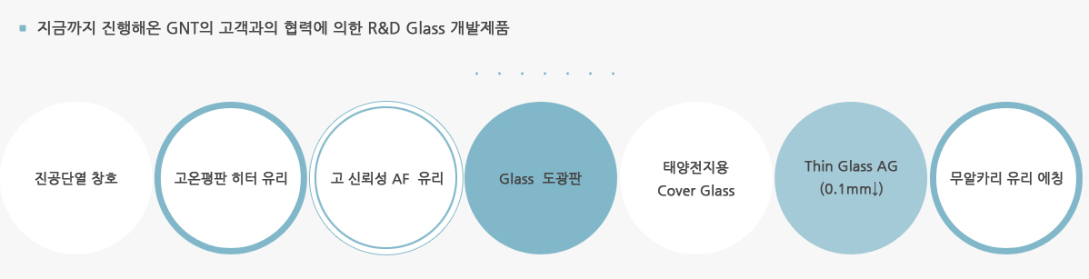 GNT는 고객의 Needs에 부흥하기 위해서 Glass 에칭 및 가공을 통한 다양한 R&D Glass 개발을 주도 하고 있으며 이를 통한 새로운 시장 개척에도 고객과 함께